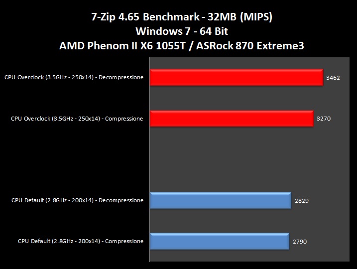 Noto programma di compressione/decompressione che al suo interno integra un tool per il benchmarking. Anche in questo caso saranno riportati nel grafico quanti KB/s il sistema, e in particolar modo la CPU, sia in grado di comprimere/decomprimere.