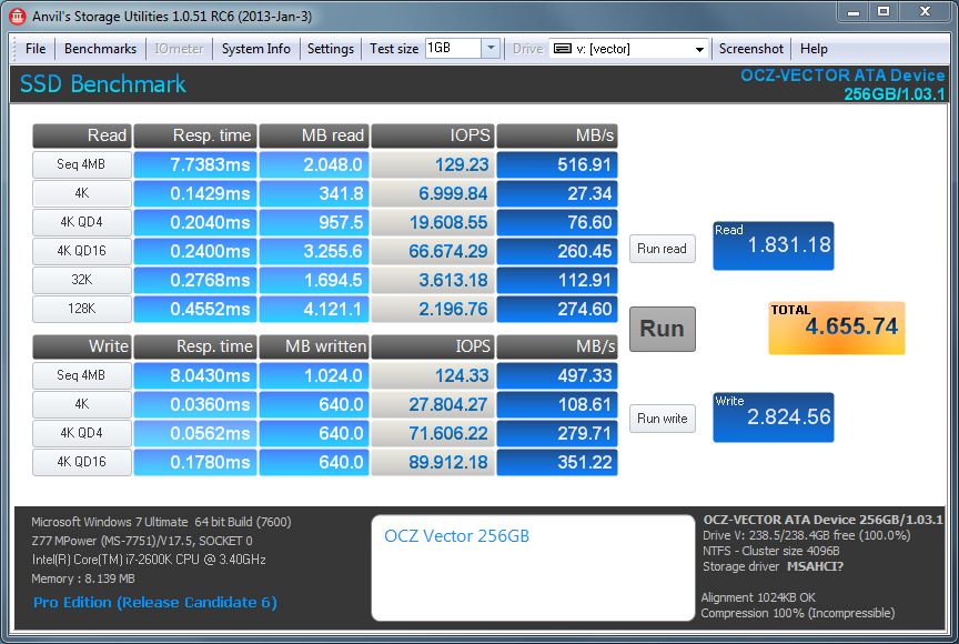 Questo nuovo bench introdotto nella nostra suite di test, chiamato Anvil's Storage Utilities, è pensato appositamente per gli SSD ed è in grado di testare i drive sotto ogni  aspetto. I risultati ottenuti sono sempre molto elevati. Con lo stesso Benchmark abbiamo provveduto ad effettuare i test occupando circa la metà del drive e occupandolo quasi completamente, è interessante notare come lo score non differisce da quello ottenuto ad SSD vuoto; stesso discorso vale occupando l'SSD quasi interamente, il OCZ Vector garantisce quindi ottime prestazioni anche con pochissimo spazio a disposizione.